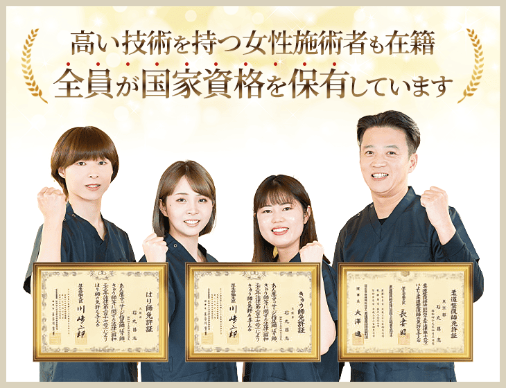 肩こり、腰痛、膝痛などの疾患以外にも不妊、逆子、自律神経失調症、不定愁訴、うつ病など多くの不調に対応ができ、その施術実績は50,000件以上を誇ります。
